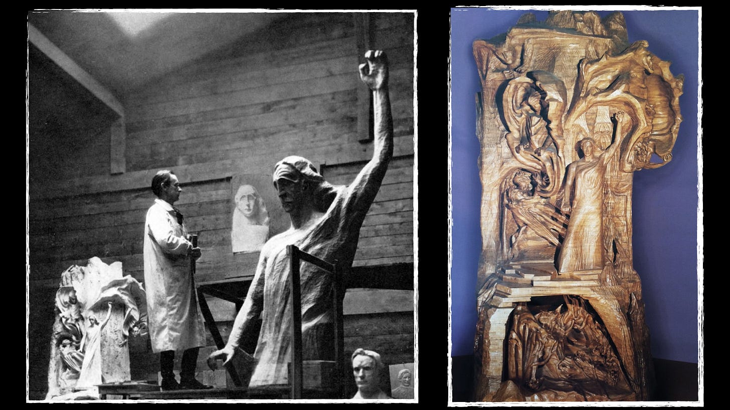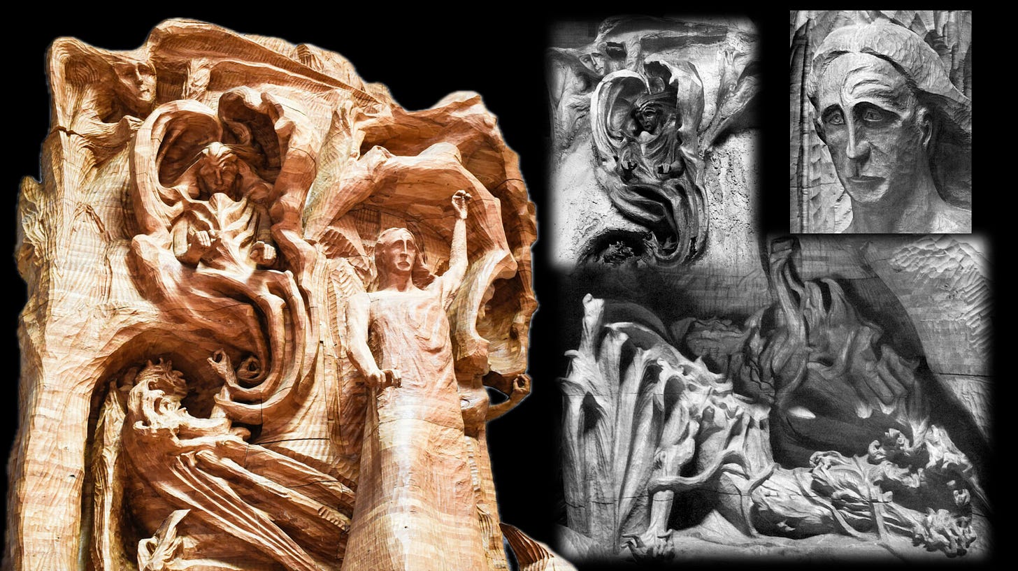 To render the balance imaginally, Segall turns to Steiner’s monumental carving The Representative of Humanity. Christ stands mediating between the descending Lucifer and the chthonic Ahriman, receiving both “in love.” Lucifer cannot bear that love and tumbles wing-broken; Ahriman cannot bear it and is bound by the earth’s gold veins. Steiner doubles each figure—the supersensible Lucifer above Christ’s left and the subsensible Ahriman below Christ’s right, and their earthly images—suggesting, in Jung’s vocabulary, the distinction between archetypes themselves in their numinous reality, and our more manageable archetypal images of them. At the top left of the composition, Steiner places “cosmic humor,” which Segall links to Jung’s “missing fourth” (matter, the feminine, the shadow/evil) needed to complete the over-spiritual Trinity; humor keeps the drama from curdling into sentimental grandiosity and returns us to proportion.